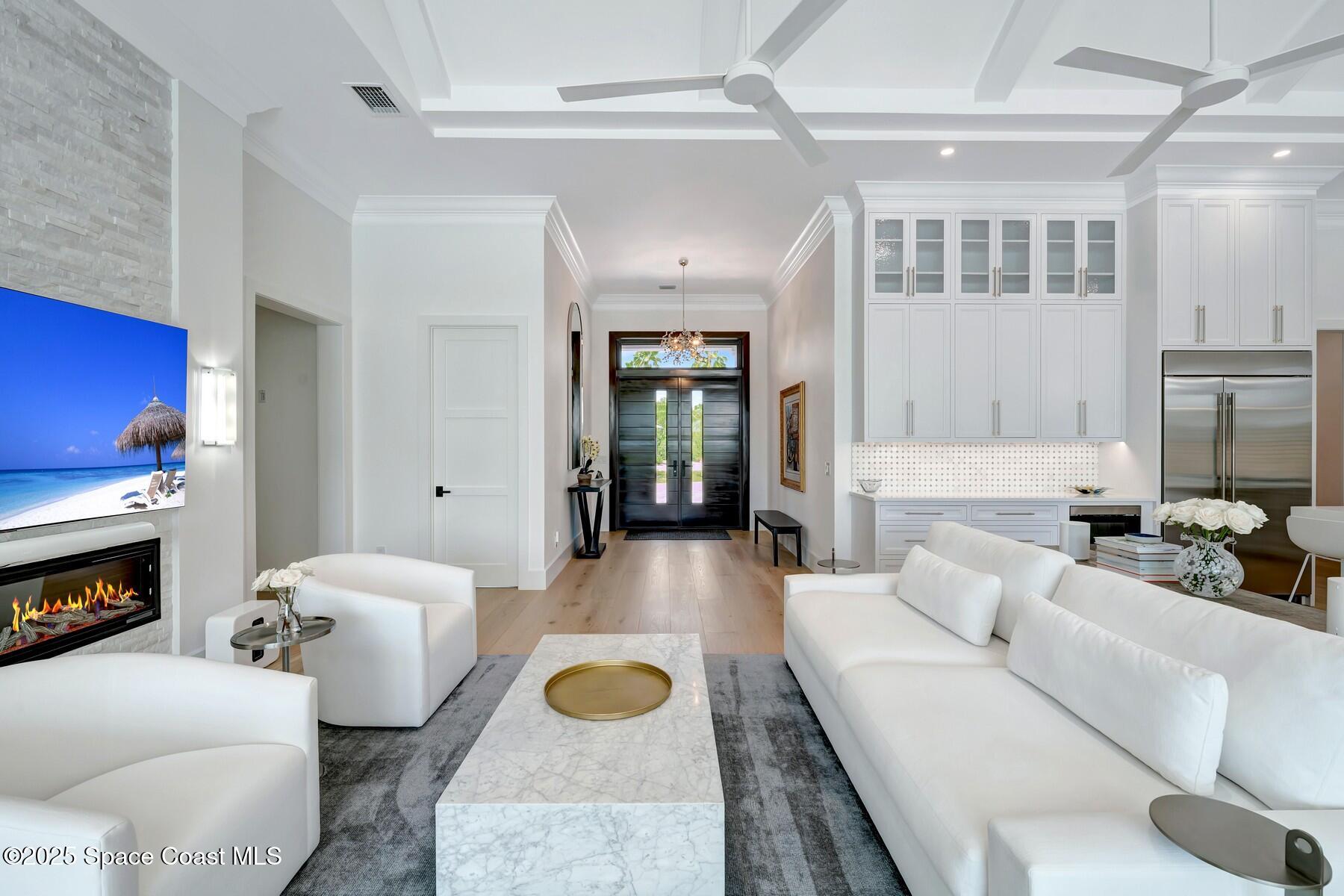 Brand new lakefront custom home in The Shores on over 0.5 acre. This 4 Bed, 3.5 Bath + Den, Flex Room & 3-car garage features top finishes, quartz counters, Subzero/Wolf appliances, walk-in pantry, custom millwork, & designer lighting. White oak plank floors throughout. Spa-like primary suite has a marble bath, rain & handheld showers. Marble patio, pool, outdoor kitchen w/ grill, beverage center, stone tops. HE A/C, Mahogany doors, impact windows/doors, foam insulation, epoxy garage. A true coastal retreat!